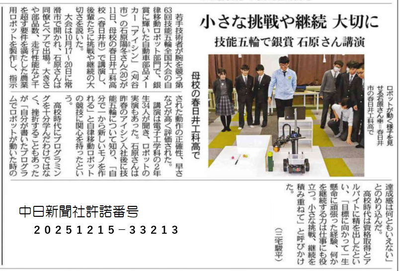 本校電子工学科卒業生の 株式会社アイシン 石原 陽冬さん が、令和7年10月に行われた第63回技能五輪全国大会 自律移動ロボット職種で初出場ながら銀メダルを獲得しました。